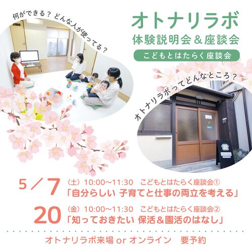 子育てコミュニティスペース オトナリラボ 2022年度 体験説明会&座談会開催! こどもとはたらく座談会② 「知っておきたい保活&園活のはなし」 開催日時:2022年5月20日(金)10:00~11:30 その他オススメ説明会・座談会 ◇4/5(火)オトナリラボのインスタライブ…