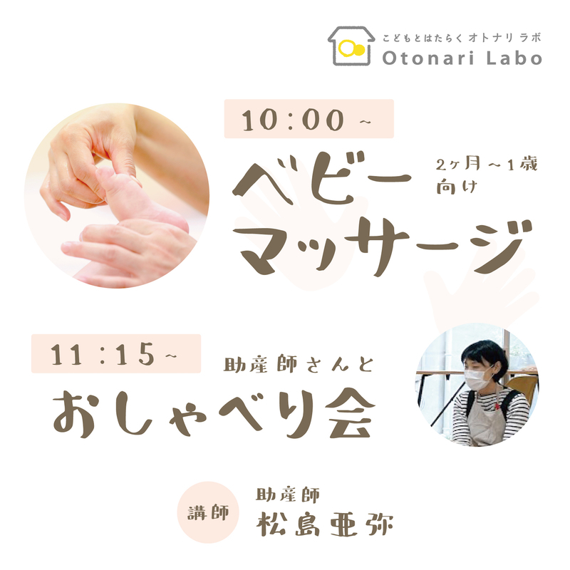 ※ベビーマッサージ教室、助産師さんとおしゃべり会の両方にご参加いただくことも可能です(イベント間の空き時間15分はオトナリラボにてお過ごしください)。