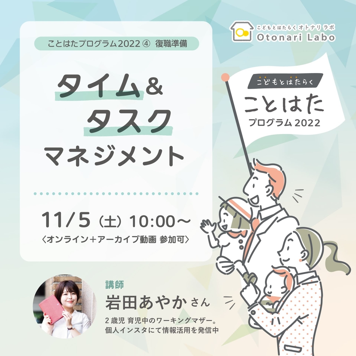 今回は、手帳術セミナーの講師経験ありの現役ワーママ・岩田あやかさんに、ご自身の「子育てとはたらく」経験談を踏まえての、アナログ手帳・デジタルツールをフル活用したタイムマネジメント法を伝授いただきます!復職・再就職後の生活の見通しを立て、自分に適した管理ツールを発見し、パートナーとの家事・育児分担の検討や生活の見直しをしていくきっかけに、ぜひご活用ください。新年に向けて、新しい手帳やガジェットを検討している方にもオススメ!